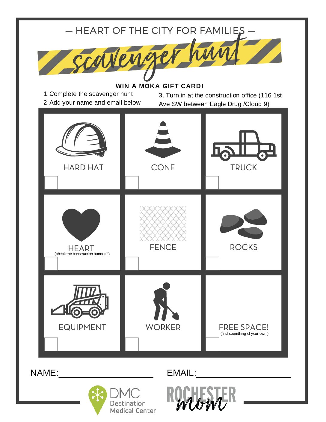 This week, we have an extra fun scavenger hunt for you to print (see below). There is really important work being done downtown right now on the infrastructure of the project…and that means the chance to see some extra fun construction equipment! Head downtown, look for all the items, and drop off your complete scavenger hunt in the construction office dropbox (116 1st Avenue SE between Eagle Drug and Cloud9) and you could be entered to win a MOKA gift card weekly!