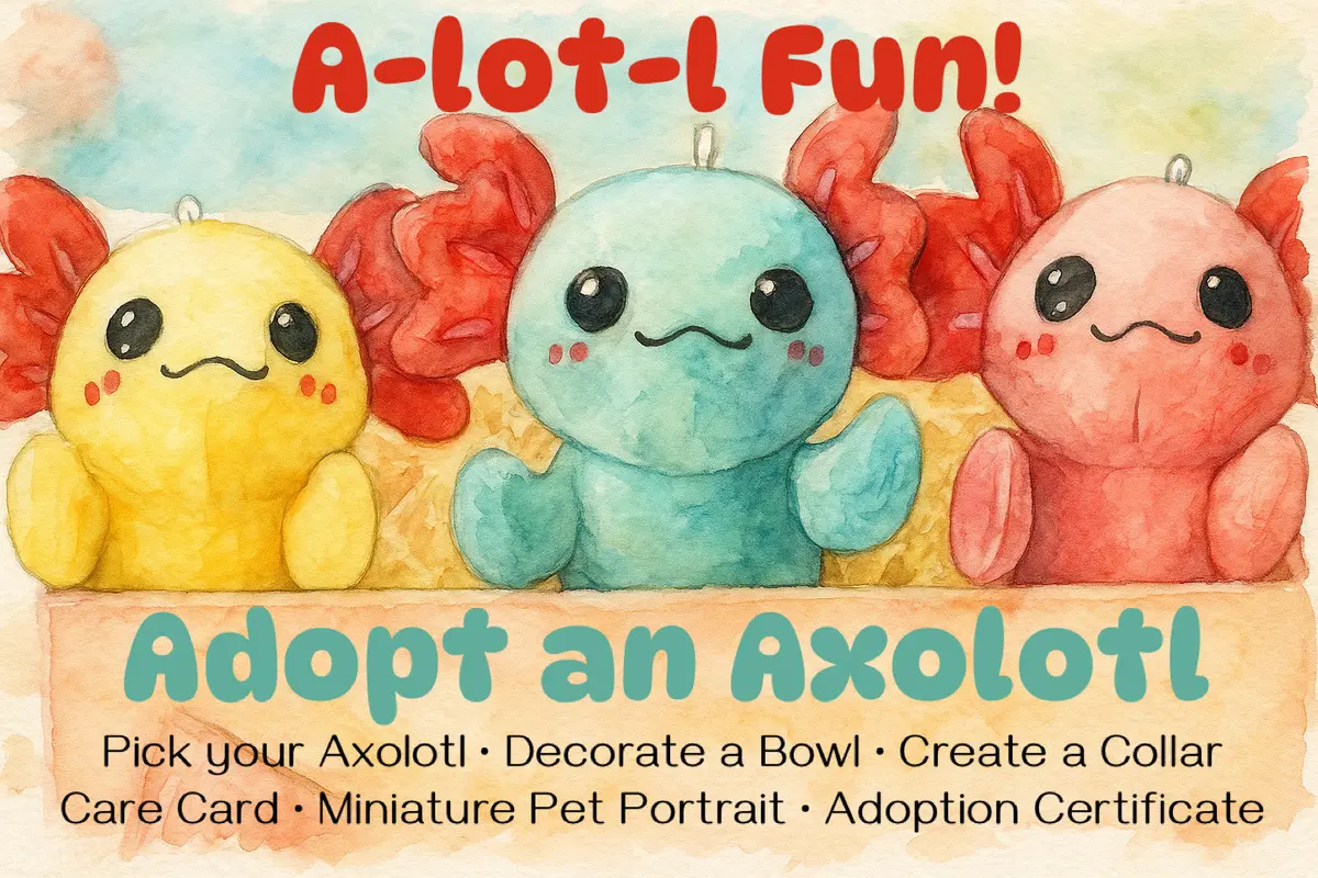 Choose your adorable stuffed axolotl, decorate a special bowl, and design a tiny collar just for your new friend. You’ll also create a mini pet portrait, care card, and receive your official adoption certificate!
