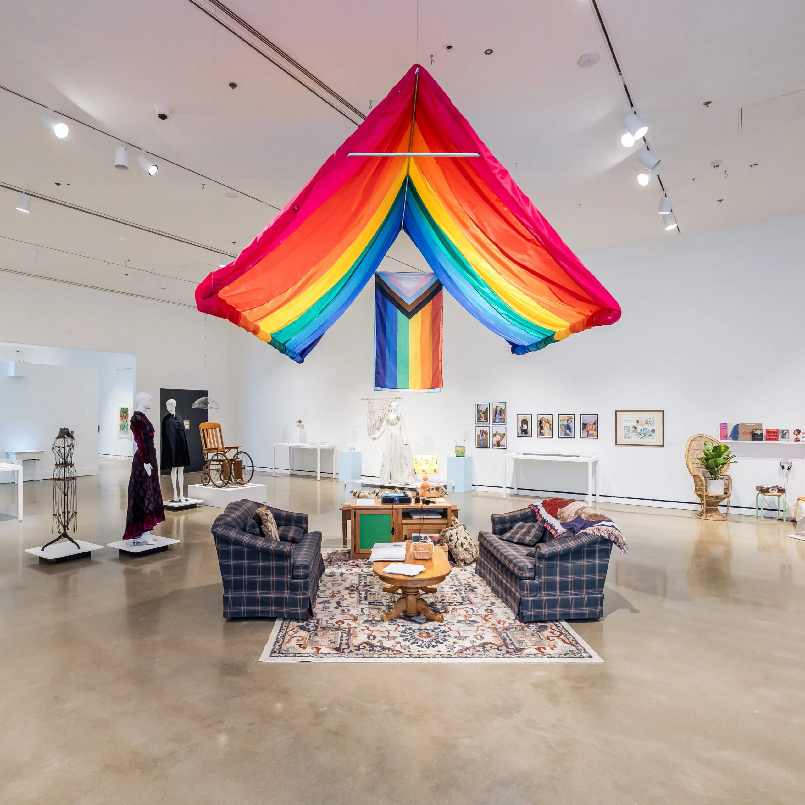 Created in response to a historic Pride flag, this immersive installation invites you beneath a vibrant flag “roof” into a cozy, living-room–like space designed for comfort, reflection, and connection. Guests are encouraged to explore, flip through stories from Rochester’s community, play a record, and even contribute their own response to the prompt: “Home is where…?”