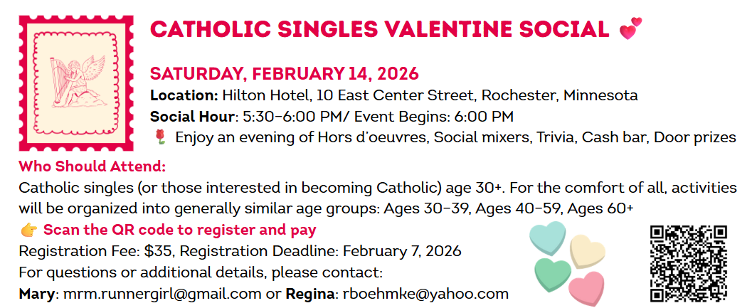Catholic singles (or those interested in becoming Catholic) age 30+. For the comfort of all, activities will be organized into generally similar age groups: Ages 30-39, Ages 40-59, Ages 60+