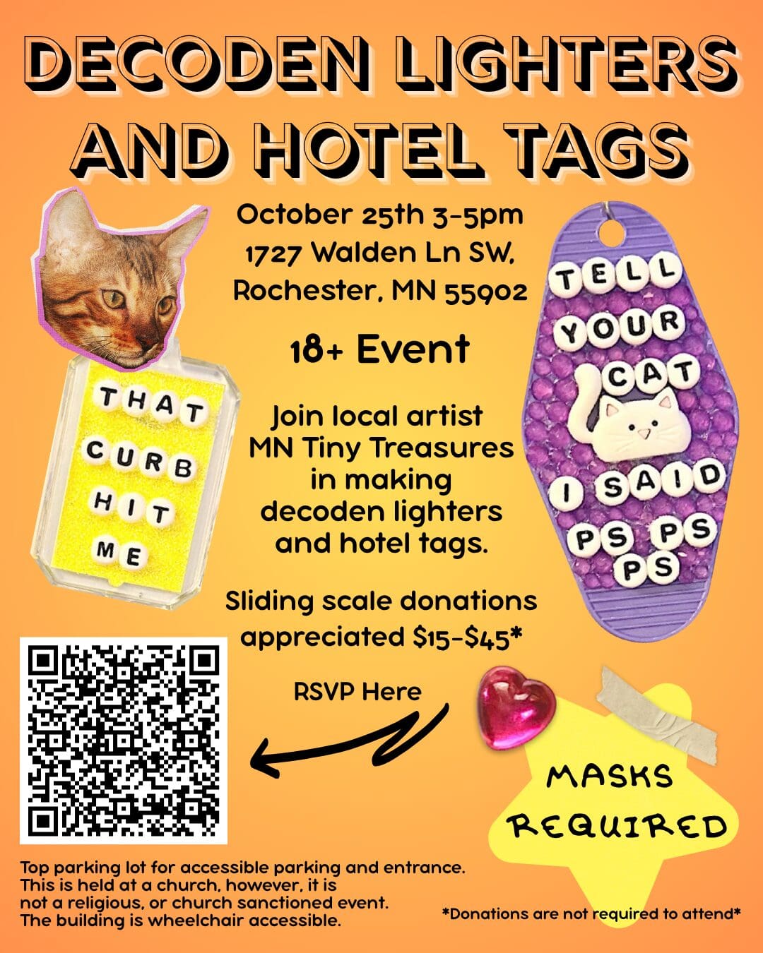 Join local artist MN Tiny Treasures in making decoden hotel tags and/or lighters- decoden is a craft technique utilizing embellishments to decorate a surface. This is an 18+ event, and masks will be required. This will take place on October 25th from 3-5pm. Donations are greatly appreciated as they make these affordable and accessible classes possible! The recommended sliding scale for this class is $15-$35. The event takes places at 1727 Walden Ln SW, Rochester, MN 55902, this is a church, however, it is not religious in nature nor a church sanctioned event. If you have any questions, please contact Chantelle at mntinytreasures@gmail.com, or use the comments section of the google form on the flyer.
