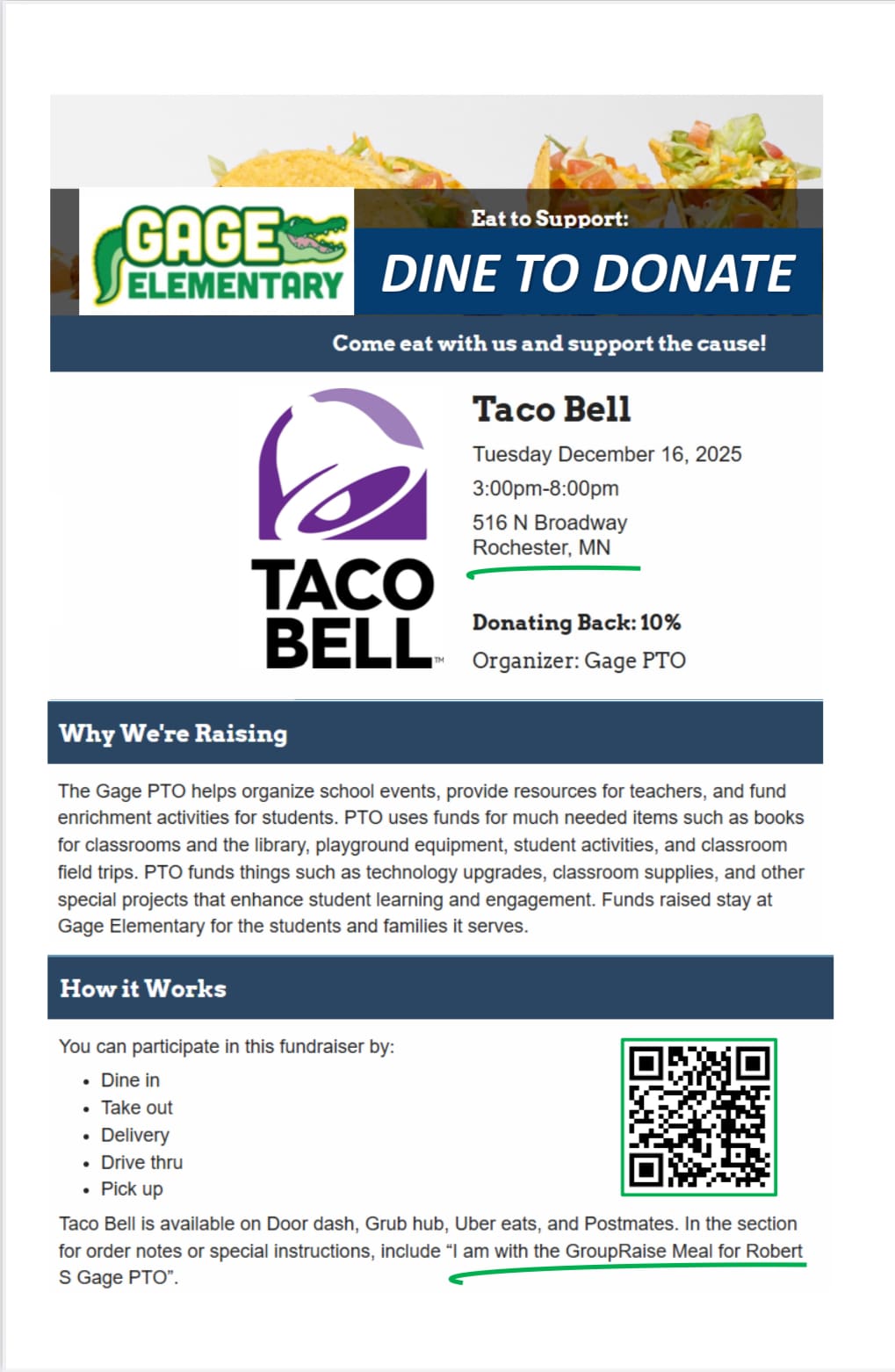 Skip the dishes and come join us for a yummy meal at Taco Bell on N. Broadway! Taco Bell is donating back 10% of sales to support Gage Elementary School PTO!