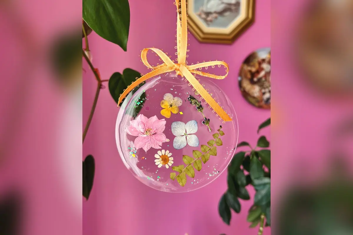 She will guide you through this class, step by step. During class you will complete an acrylic sun catcher with dried florals, greenery, gold leafing and more! We will finish our ornaments with a variety of ribbon colors for hanging!