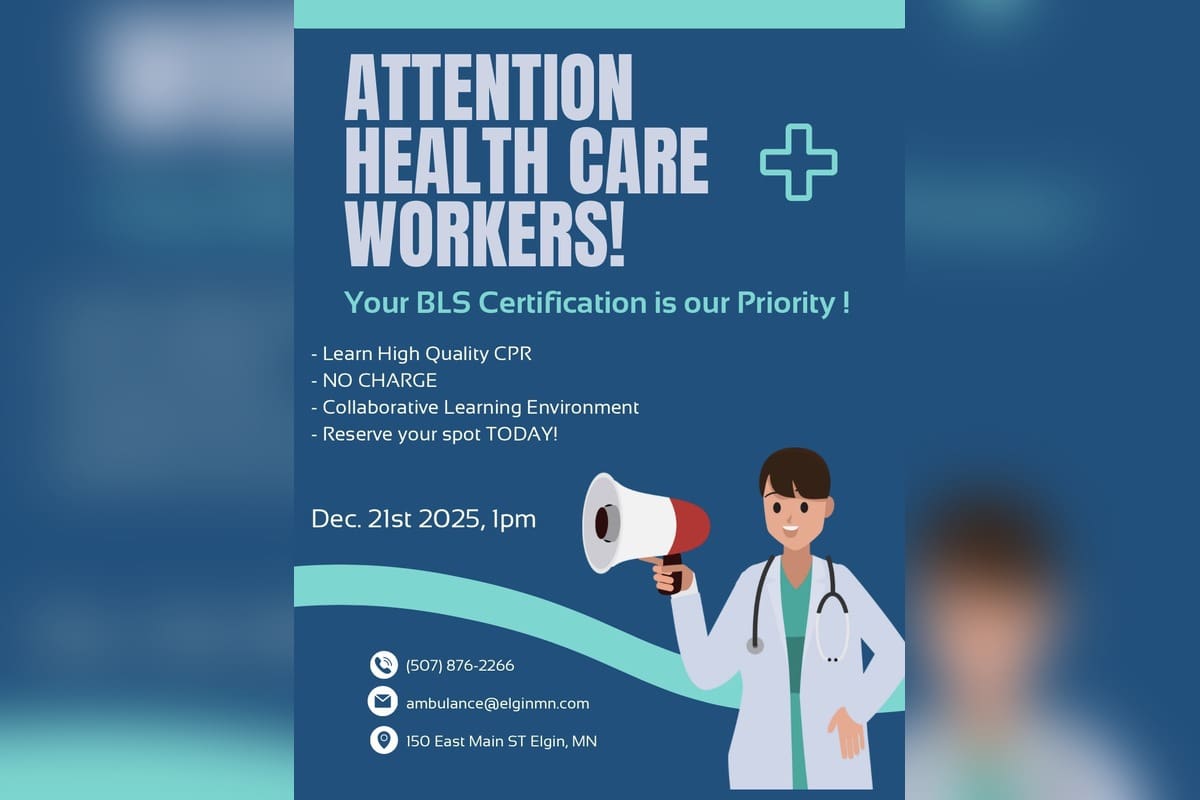 Please email ambulance@elginmn.com to reserve your spot for this FREE BLS CPR/AED course. Please reach out if you have any questions.
