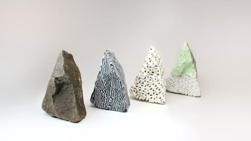 In Hard Copy she explores this transformation through her fascination for and her practice of collecting rocks. As the artist writes: “At the core of my work are rocks and minerals—materials with a geological timeline that predates human history. These natural forms, shaped by millennia, serve as both inspiration and raw material.” Attracted by their memory, form, and inclusions, Smith has collected stones for years. “Now, I assess them differently—considering their spatial presence, angles, and potential as digital scans.” This multilayered way of looking at simple objects is mirrored in her process: first she scans rocks using photogrammetry or other digital scanning processes, then she brings them into CAD environments to later reinterpret them using 3D printing in clay and plastic. From that, she creates molds that allow her to reproduce multiples and experiment with decoration.