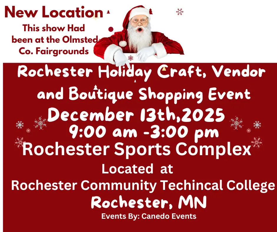 We have such exciting news!! We have moved the Rochester Fall Craft,Vendors, Boutique show to the Rochester Sports Complex at Rochester Community Technical College. The Olmsted County Fairground will be under construction for the next few years and we will not have use to building 41 or 25!!! We are moving starting the Fall show and the shows will be held here for future shows. More info coming soon!!! So excited!!! Free admission and lots of door prizes.