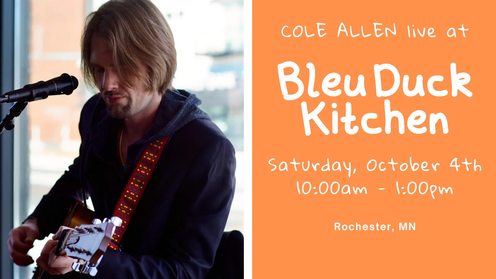 Cole Allen will be performing solo acoustic at Bleu Duck Kitchen’s brunch in Rochester, MN on Saturday from 10-1.