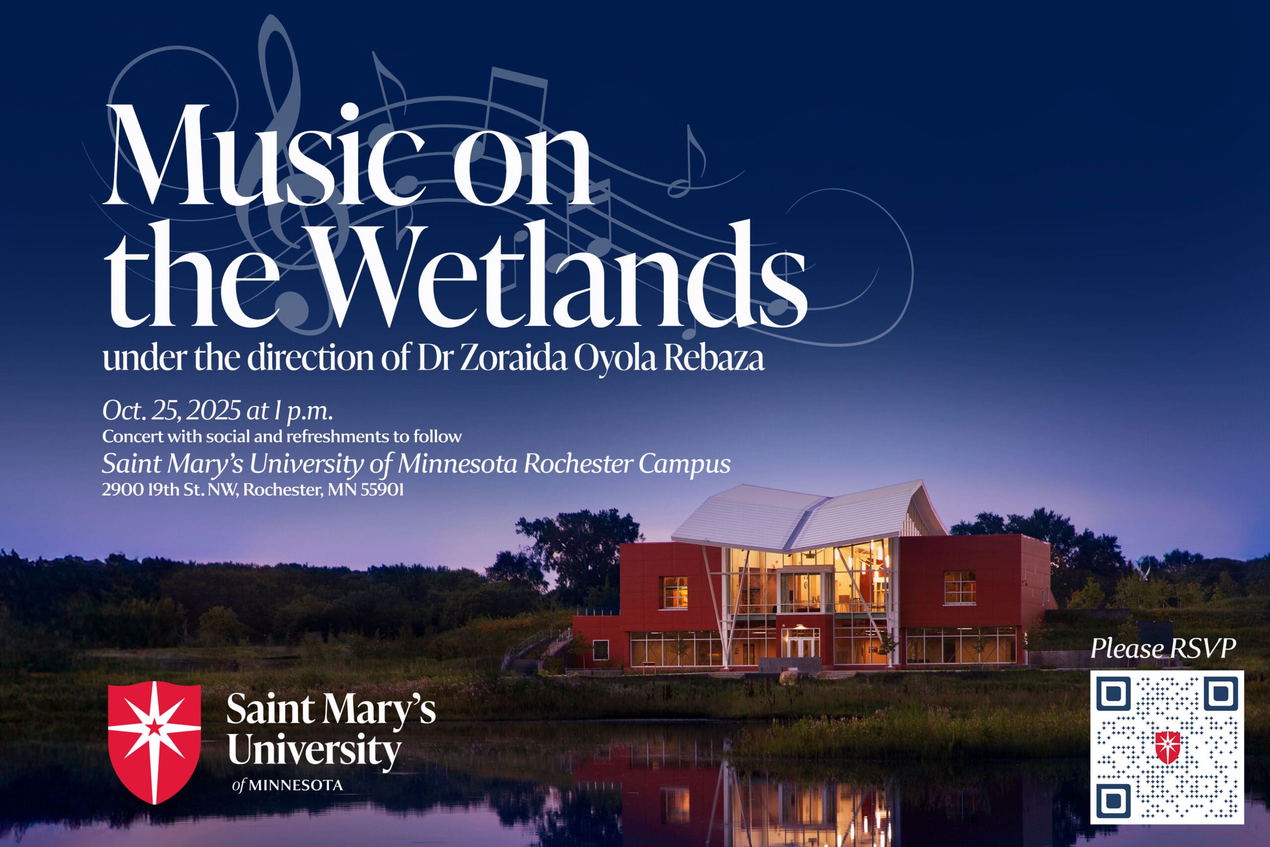 The Saint Mary’s University band, choir, and ensembles under the direction of Dr. Zoraida Oyola Rebaza invite you to experience an afternoon of music on the wetlands. Come enjoy the beauty of Rochester Campus this fall and savor refreshments on the patio