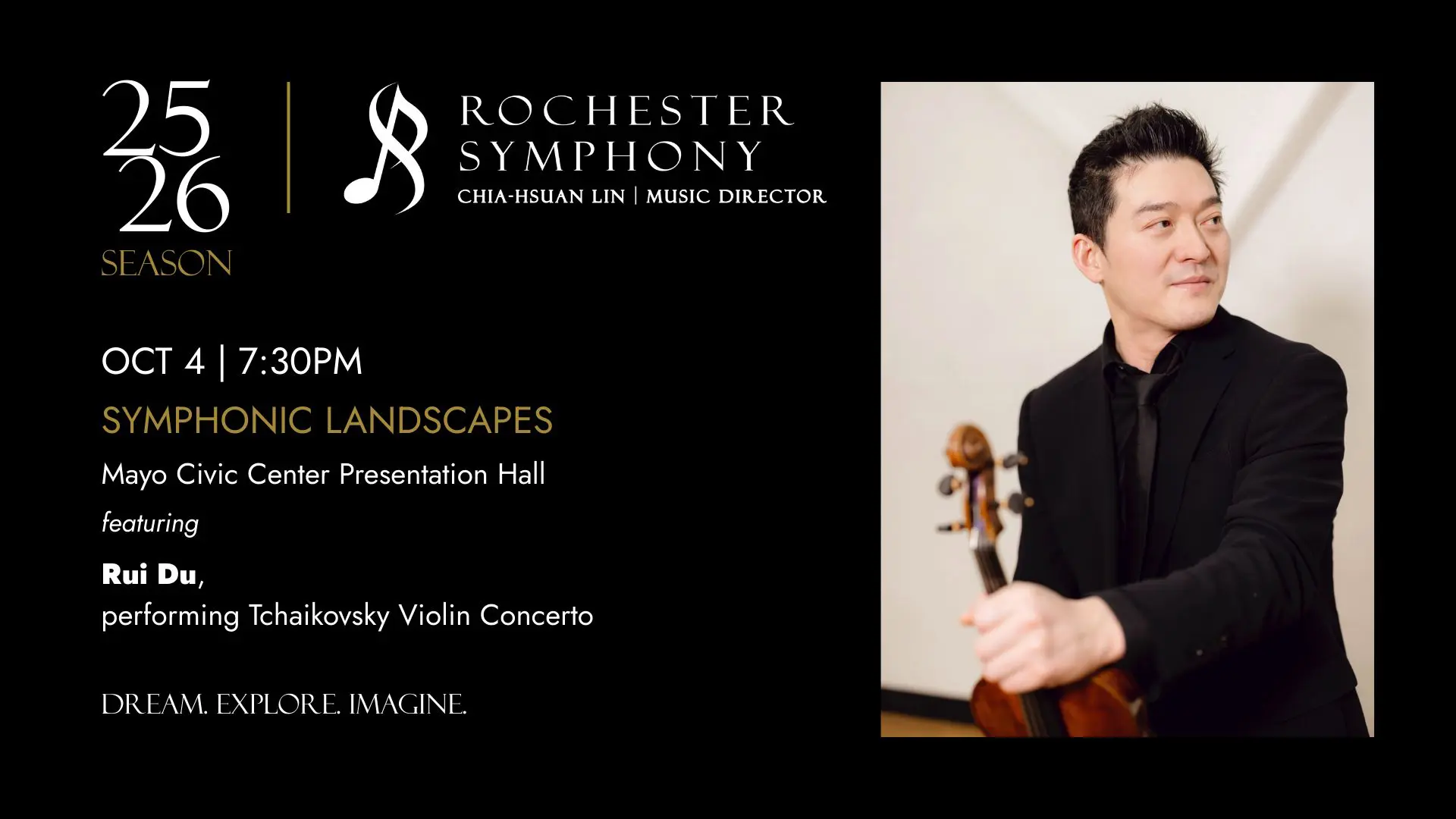 We open the season with a musical journey that explores landscapes of nature and the soul. Deep Summer Music, from celebrated Minnesota composer Libby Larsen, captures the light and sweeping horizon of the prairie in late summer. Tchaikovsky’s Violin Concerto, bursting with emotion and fiery energy, showcases dynamic violin soloist Rui Du against a backdrop of lush orchestral color. The evening concludes with Brahms’ monumental Symphony No. 1, which moves from brooding tension to radiant resolution. Tickets at WWW.ROCHESTERSYMPHONY.ORG.