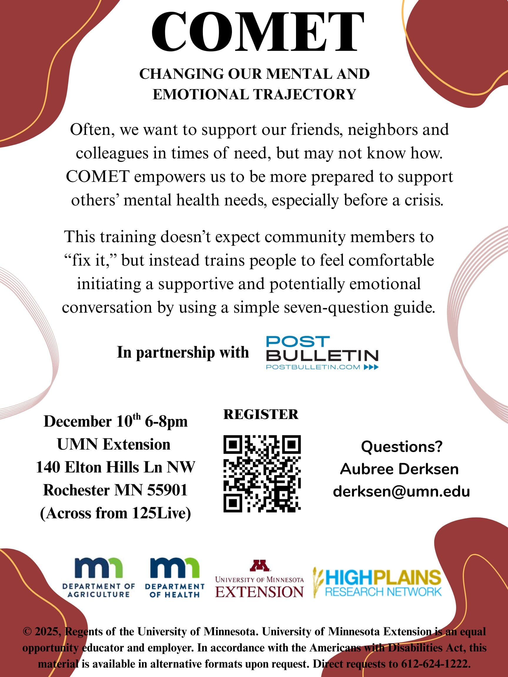 **RSVP Required** COMET (Changing Our Mental and Emotional Trajectory) is a two-hour training that teaches participants how to reach out in a meaningful, respectful and supportive way to friends, co-workers or acquaintances who seem to be struggling somewhere between wellness and a mental health crisis. While designed for rural and farming communities, it can also be used in urban and suburban settings.