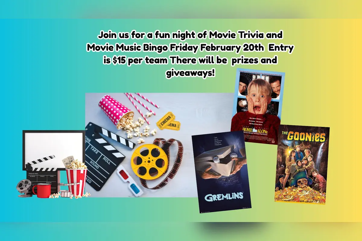 Join us for a fun night of Movie Trivia and Music Bingo. Bring yourself or bring your squad, Teams of 3 is only $15. We will be handing out prizes and giveaways