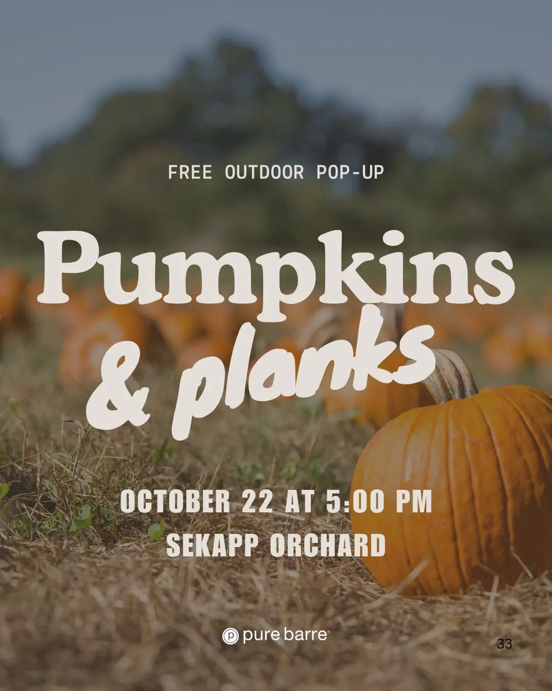 Join us for a free Pop-Up at Sekapp Orchard. Bring a mat, water bottle, and a friend for a 50 minute outside fusion class to celebrate Fall. We will be meeting and taking class in the pumpkin area right outside the orchard.