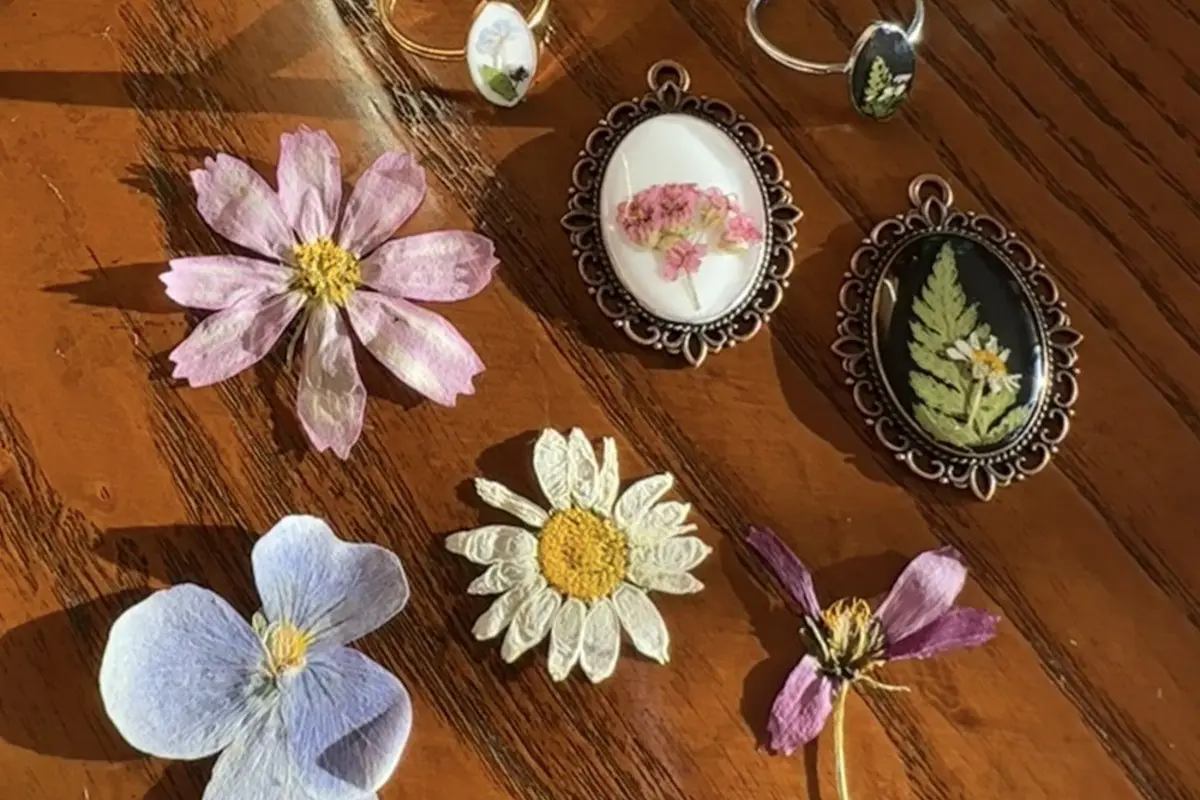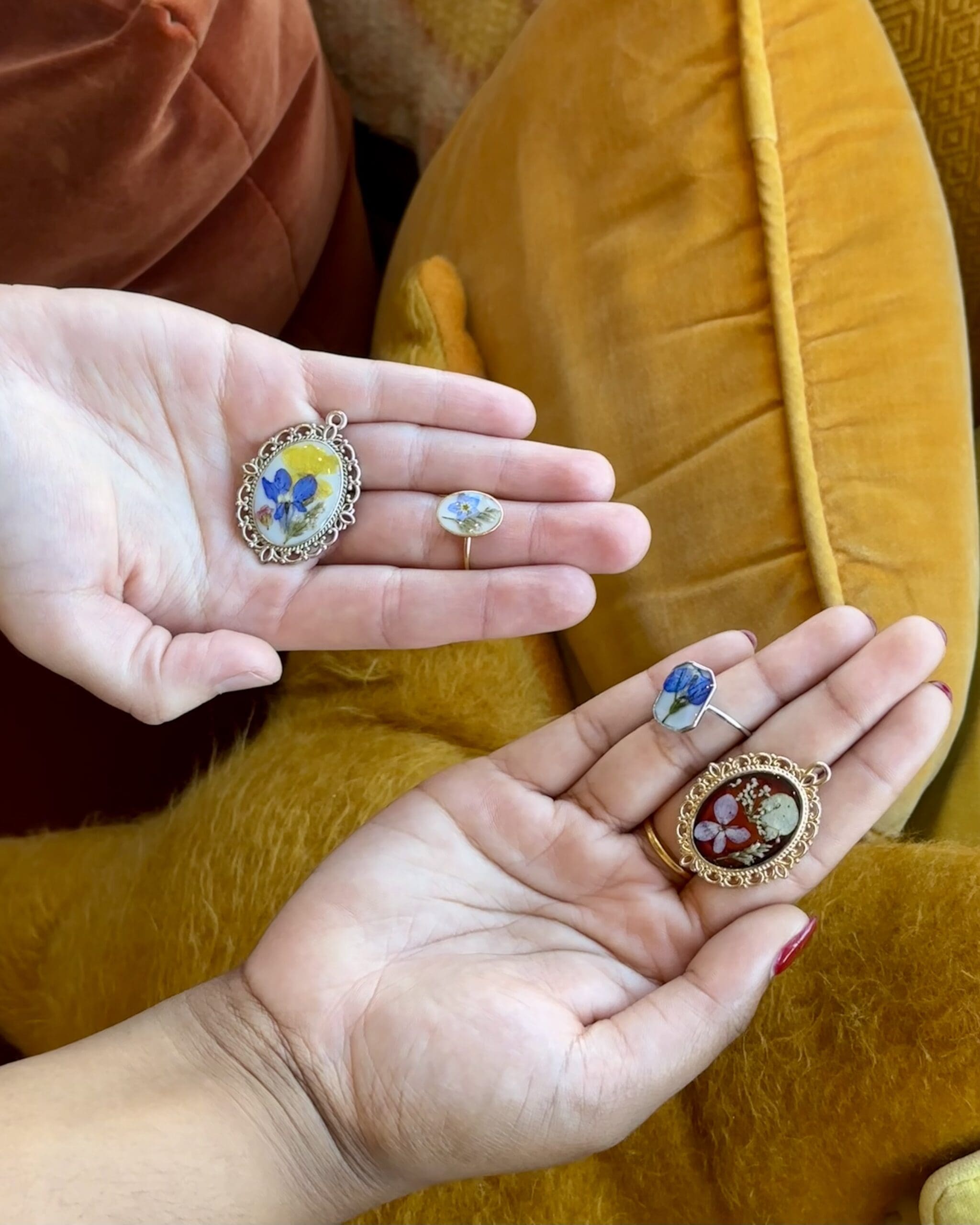 During your session you will complete a both a ring and a pendant with dried florals and greenery pressed by Lavender & Violas.