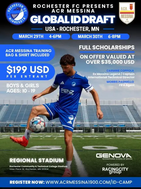 Rochester FC is proud to announce a landmark partnership with ACR Messina (Italy) and Real Vallecano (Spain) to host the Global ID Draft/Showcase right here in Minnesota.