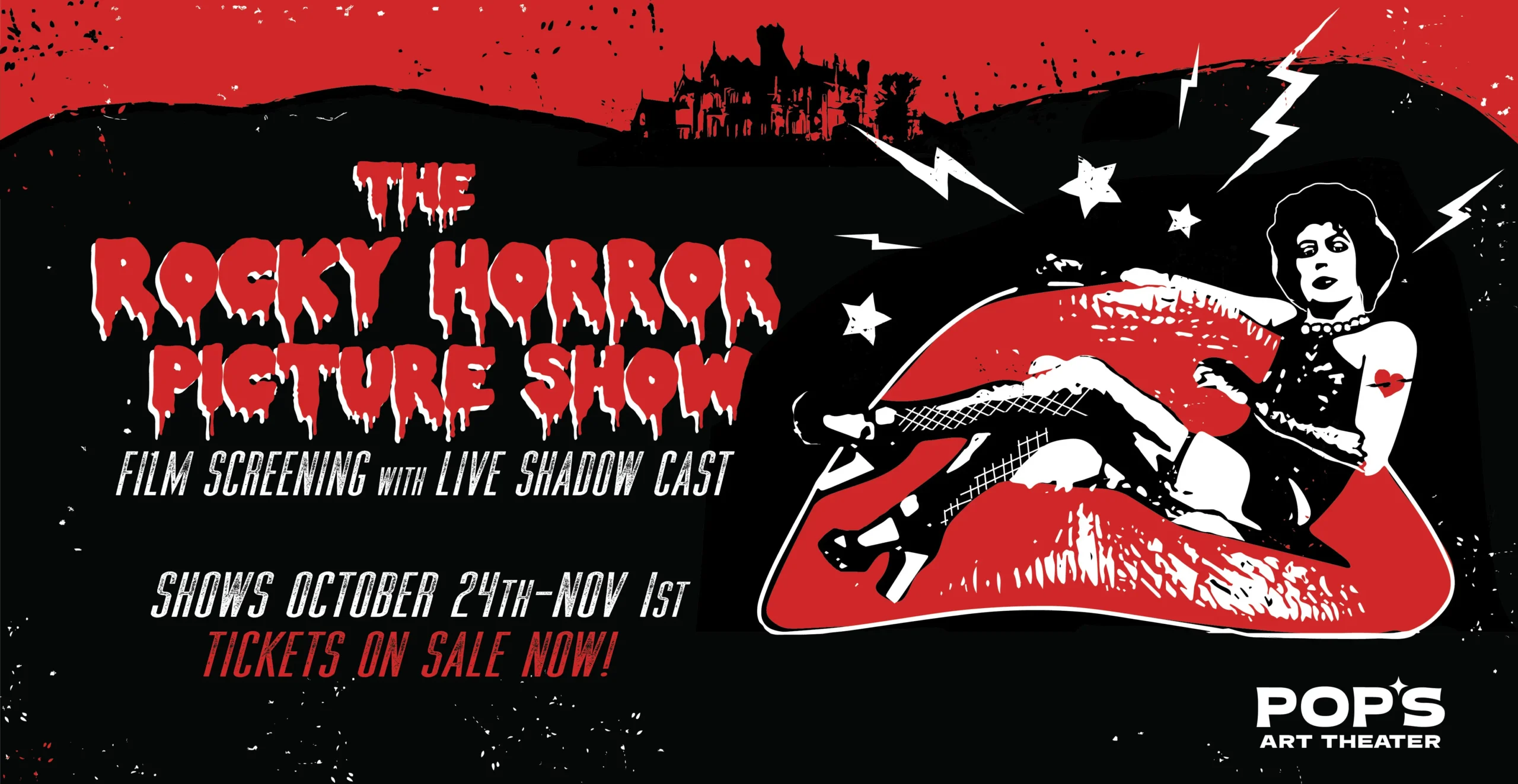 Coming to Pop’s Art Theater from Oct 24th – Nov 1st, THE ROCKY HORROR PICTURE SHOW (1975) with a LIVE community shadow cast. Give yourself over to absolute pleasure for an experience unlike any other!