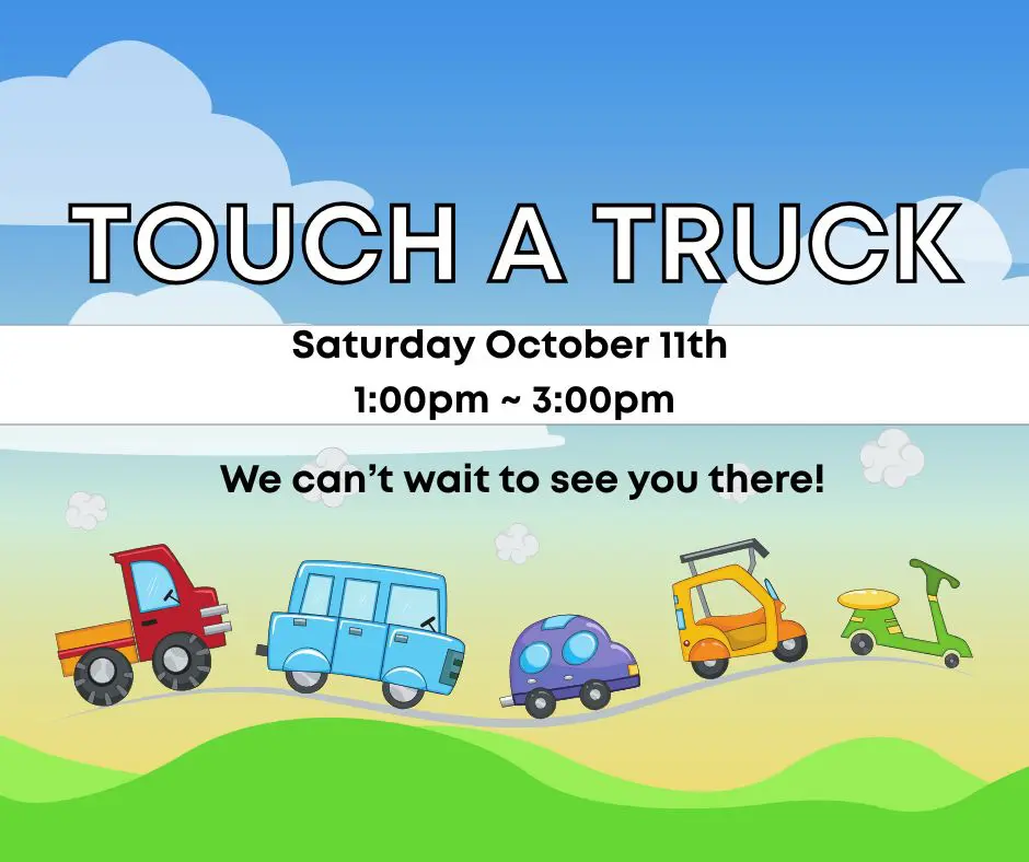Free Event! – Explore a variety of vehicles used around town. See a police car, ambulance, fire truck, all-terrain vehicle, excavator, skid loader, and many more! We can’t wait to see you there!!