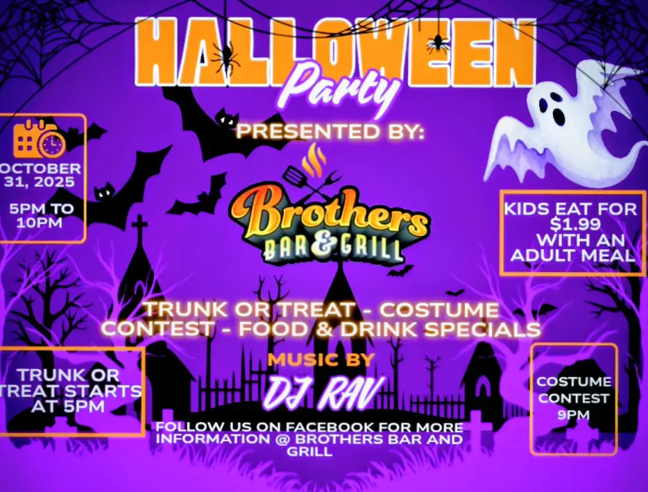 Come on out to Brother’s bar and Grill for a spooky family fun night. Trunk or treat starts at 5pm in the back parking lot. $1.99 kids meals, DJ, and costumes contest.