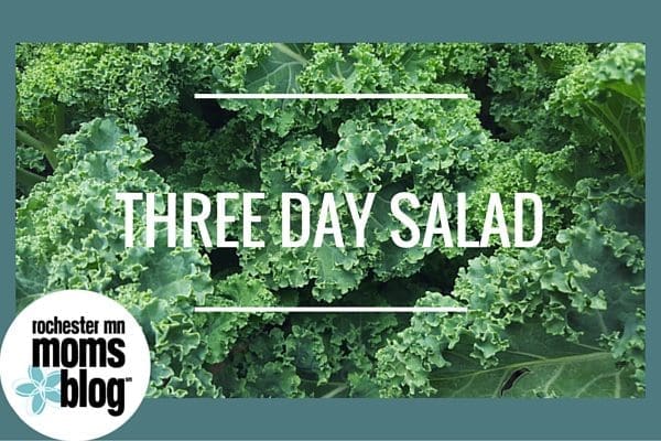 Never fear! The following recipe contains everyone’s favorite “superfood”–kale. The best part (besides the amazing flavor and heartiness) of this recipe is that it lasts up to three days in the fridge, tasting and crunching as good on day three as it does the first time. Whether you’re a dedicated kale fan or scared of a salad without macaroni noodles, give this salad a try–you may be surprised! This recipe has many parts that are more for less to taste, but here are my guidelines: