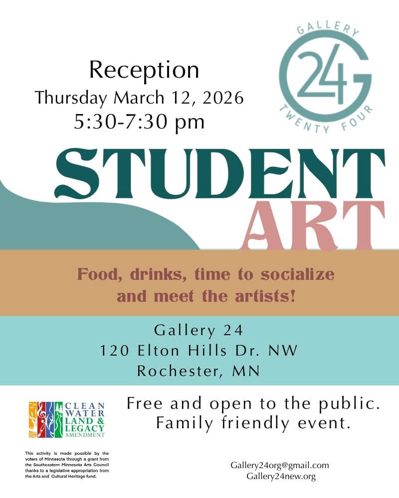 Student Artists: join the exhibition! Any area student, any medium, any subject! Please send submissions to gallery24org@gmail.com by February 25th. Please include a photo of your work, title of piece, size, medium, price (if for sale), artist’s name and age/school (whatever you’re comfortable sharing) All are welcome to the reception,...