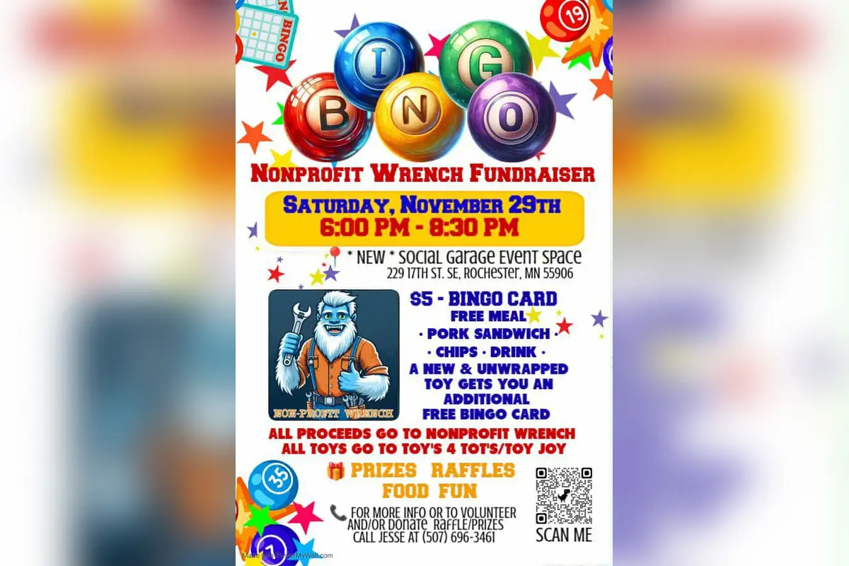 Social Garage 229 17th Street SE, Rochester, MN, United StatesDUE TO HEAVY SNOW WE ARE RESCHEDULING TO SATURDAY DEC. 5TH 6PM Come out for a night of fun and the new community event space Social Garage. Free food, raffles, and Bingo! Proceeds support the 501c3 Non-Profit Wrench Inc