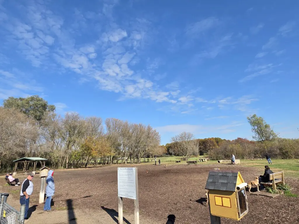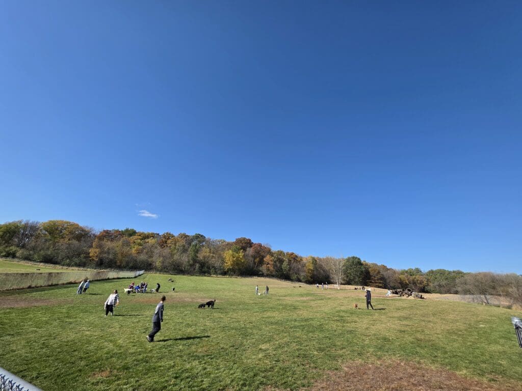 Shade is limited, so plan ahead on hot days. The ground is mostly grass with some exposed dirt, which can make for a muddy pup depending on the weather. Be sure to bring your own water and poop bags. There’s a dumpster located nearby for easy cleanup.