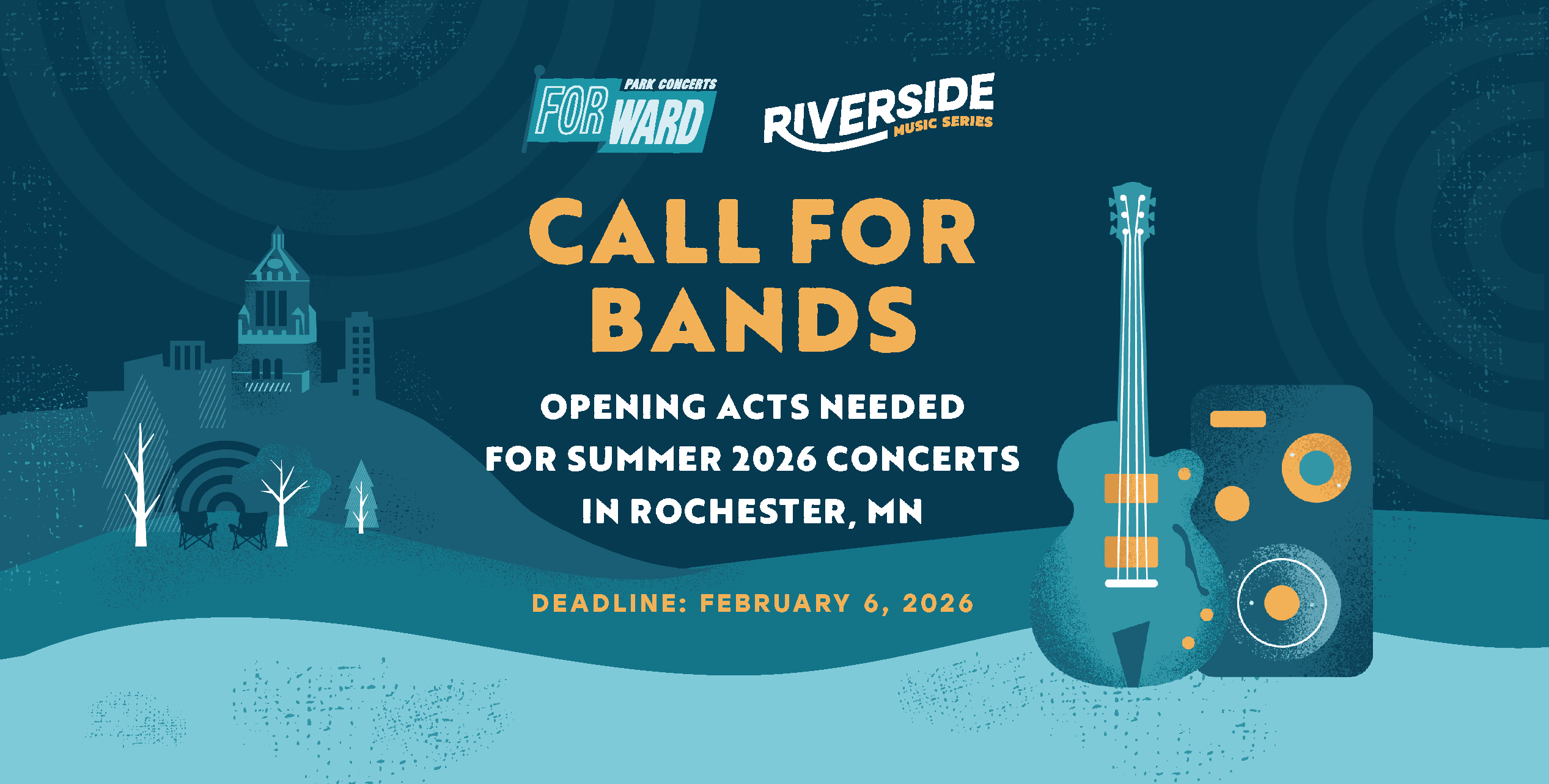 Rochester Public Music is looking for local and regional bands to open for the 2026 Riverside Music Series and FORWARD Park Concerts. If your band is interested in performing at one of these fantastic summer events, now is your chance! This paid gig is a great opportunity for local talent.