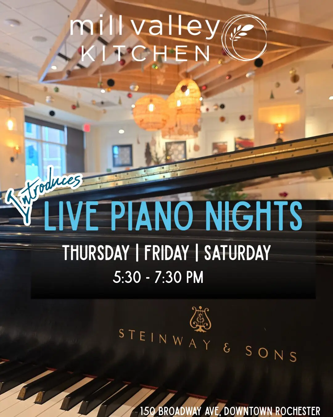 Live Piano Nights with Mill Valley Kitchen by December 21, 2025 50 events found. Events Search and Views Navigation Search Enter Keyword. Search for Events by Keyword. Enter Location. Search for Events by Location. Find Events Event Views Navigation Summary List Month Day Today Now Now - 4/18/2026 April 18, 2026 Select date. Dec 2025 Fri 26 5:30 pm - 7:30 pm LIVE MUSIC – Piano Nights | Mill Valley Kitchen Free Sat 27 5:30 pm - 7:30 pm LIVE MUSIC – Piano Nights | Mill Valley Kitchen Free Jan 2026 Thu 1 5:30 pm - 7:30 pm LIVE MUSIC – Piano Nights | Mill Valley Kitchen Free Fri 2 5:30 pm - 7:30 pm LIVE MUSIC – Piano Nights | Mill Valley Kitchen Free Sat 3 5:30 pm - 7:30 pm LIVE MUSIC – Piano Nights | Mill Valley Kitchen Free Thu 8 5:30 pm - 7:30 pm LIVE MUSIC – Piano Nights | Mill Valley Kitchen Free Fri 9 5:30 pm - 7:30 pm LIVE MUSIC – Piano Nights | Mill Valley Kitchen Free Sat 10 5:30 pm - 7:30 pm LIVE MUSIC – Piano Nights | Mill Valley Kitchen Free Thu 15 5:30 pm - 7:30 pm LIVE MUSIC – Piano Nights | Mill Valley Kitchen Free Fri 16 5:30 pm - 7:30 pm LIVE MUSIC – Piano Nights | Mill Valley Kitchen Free Sat 17 5:30 pm - 7:30 pm LIVE MUSIC – Piano Nights | Mill Valley Kitchen Free Thu 22 5:30 pm - 7:30 pm LIVE MUSIC – Piano Nights | Mill Valley Kitchen Free Fri 23 5:30 pm - 7:30 pm LIVE MUSIC – Piano Nights | Mill Valley Kitchen Free Sat 24 5:30 pm - 7:30 pm LIVE MUSIC – Piano Nights | Mill Valley Kitchen Free Thu 29 5:30 pm - 7:30 pm LIVE MUSIC – Piano Nights | Mill Valley Kitchen Free Fri 30 5:30 pm - 7:30 pm LIVE MUSIC – Piano Nights | Mill Valley Kitchen Free Sat 31 5:30 pm - 7:30 pm LIVE MUSIC – Piano Nights | Mill Valley Kitchen Free Feb 2026 Thu 5 5:30 pm - 7:30 pm LIVE MUSIC – Piano Nights | Mill Valley Kitchen Free Fri 6 5:30 pm - 7:30 pm LIVE MUSIC – Piano Nights | Mill Valley Kitchen Free Sat 7 5:30 pm - 7:30 pm LIVE MUSIC – Piano Nights | Mill Valley Kitchen Free Thu 12 5:30 pm - 7:30 pm LIVE MUSIC – Piano Nights | Mill Valley Kitchen Free Fri 13 5:30 pm - 7:30 pm LIVE MUSIC – Piano Nights | Mill Valley Kitchen Free Sat 14 5:30 pm - 7:30 pm LIVE MUSIC – Piano Nights | Mill Valley Kitchen Free Thu 19 5:30 pm - 7:30 pm LIVE MUSIC – Piano Nights | Mill Valley Kitchen Free Fri 20 5:30 pm - 7:30 pm LIVE MUSIC – Piano Nights | Mill Valley Kitchen Free Sat 21 5:30 pm - 7:30 pm LIVE MUSIC – Piano Nights | Mill Valley Kitchen Free Thu 26 5:30 pm - 7:30 pm LIVE MUSIC – Piano Nights | Mill Valley Kitchen Free Fri 27 5:30 pm - 7:30 pm LIVE MUSIC – Piano Nights | Mill Valley Kitchen Free Sat 28 5:30 pm - 7:30 pm LIVE MUSIC – Piano Nights | Mill Valley Kitchen Free Mar 2026 Thu 5 5:30 pm - 7:30 pm LIVE MUSIC – Piano Nights | Mill Valley Kitchen Free Fri 6 5:30 pm - 7:30 pm LIVE MUSIC – Piano Nights | Mill Valley Kitchen Free Sat 7 5:30 pm - 7:30 pm LIVE MUSIC – Piano Nights | Mill Valley Kitchen Free Thu 12 5:30 pm - 7:30 pm LIVE MUSIC – Piano Nights | Mill Valley Kitchen Free Fri 13 5:30 pm - 7:30 pm LIVE MUSIC – Piano Nights | Mill Valley Kitchen Free Sat 14 5:30 pm - 7:30 pm LIVE MUSIC – Piano Nights | Mill Valley Kitchen Free Thu 19 5:30 pm - 7:30 pm LIVE MUSIC – Piano Nights | Mill Valley Kitchen Free Fri 20 5:30 pm - 7:30 pm LIVE MUSIC – Piano Nights | Mill Valley Kitchen Free Sat 21 5:30 pm - 7:30 pm LIVE MUSIC – Piano Nights | Mill Valley Kitchen Free Thu 26 5:30 pm - 7:30 pm LIVE MUSIC – Piano Nights | Mill Valley Kitchen Free Fri 27 5:30 pm - 7:30 pm LIVE MUSIC – Piano Nights | Mill Valley Kitchen Free Sat 28 5:30 pm - 7:30 pm LIVE MUSIC – Piano Nights | Mill Valley Kitchen Free Apr 2026 Thu 2 5:30 pm - 7:30 pm LIVE MUSIC – Piano Nights | Mill Valley Kitchen Free Fri 3 5:30 pm - 7:30 pm LIVE MUSIC – Piano Nights | Mill Valley Kitchen Free Sat 4 5:30 pm - 7:30 pm LIVE MUSIC – Piano Nights | Mill Valley Kitchen Free Thu 9 5:30 pm - 7:30 pm LIVE MUSIC – Piano Nights | Mill Valley Kitchen Free Fri 10 5:30 pm - 7:30 pm LIVE MUSIC – Piano Nights | Mill Valley Kitchen Free Sat 11 5:30 pm - 7:30 pm LIVE MUSIC – Piano Nights | Mill Valley Kitchen Free Thu 16 5:30 pm - 7:30 pm LIVE MUSIC – Piano Nights | Mill Valley Kitchen Free Fri 17 5:30 pm - 7:30 pm LIVE MUSIC – Piano Nights | Mill Valley Kitchen Free Sat 18 5:30 pm - 7:30 pm LIVE MUSIC – Piano Nights | Mill Valley Kitchen Free Previous Events Today Next Events Subscribe to calendar Google Calendar iCalendar Outlook 365 Outlook Live Export .ics file Export Outlook .ics file