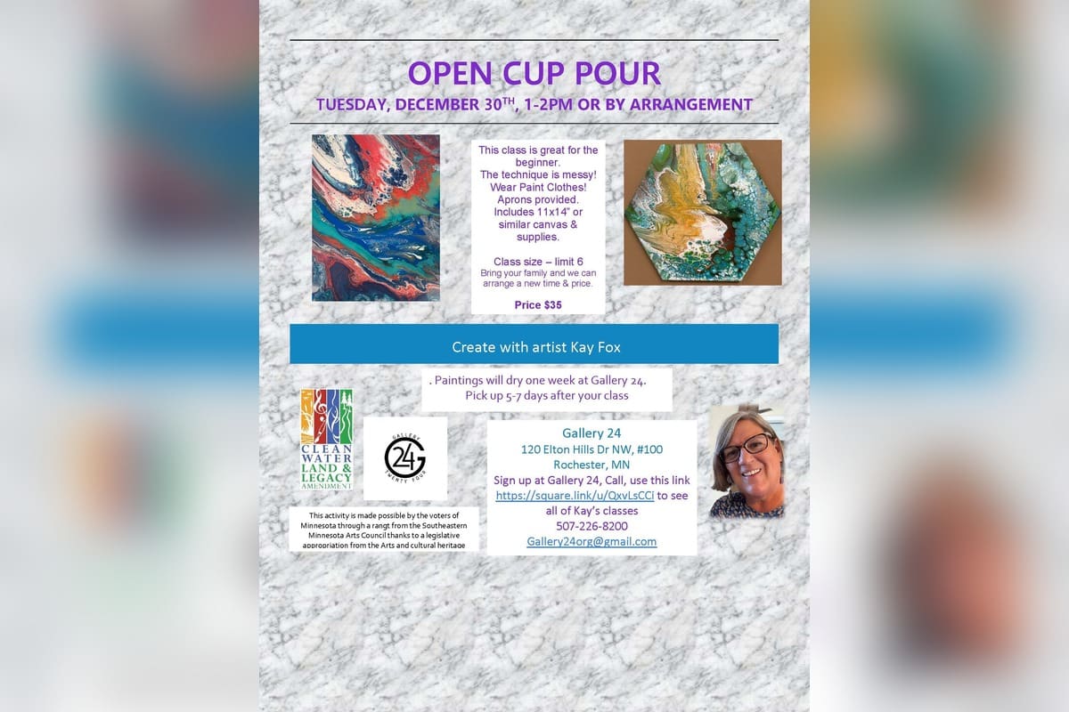 Gallery 24 609 N. Broadway Ave, Rochester, United StatesOpen Cup Pour Class $35 Tuesday December 30, 2025 1pm - 2 pm or by arrangement This class is great for the beginner. The technique is messy! Wear paint clothes! Aprons provided. Includes 11x14” canvas and supplies. sign up and pay here - https://square.link/u/QxvLsCCi Class size - limit 6 Bring...